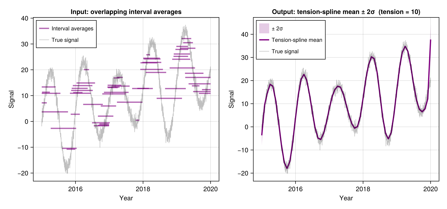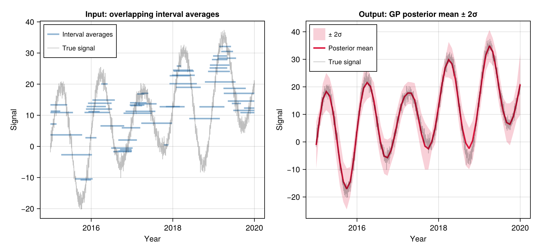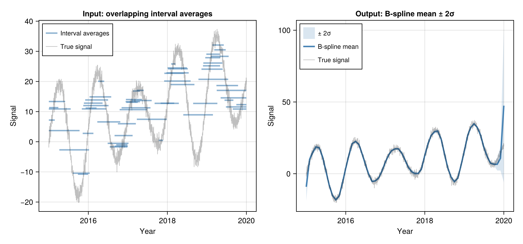 ), y, t1, t2)obs_noise calibration: When calibrate_noise=true (default), the method iteratively adjusts obs_noise to the value where the weighted RMS of interval-average residuals equals sqrt(obs_noise). This is an empirical Bayes fixed-point that makes the posterior mean insensitive to the initial obs_noise value — useful when obs_noise is hard to set a priori (e.g. when data units or scale are unknown). Set calibrate_noise=false to use obs_noise exactly as specified.